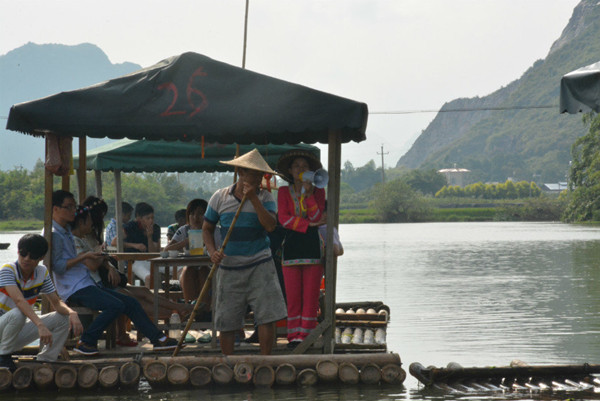 我們一行人乘坐幾條竹筏,逆流而上。隨行的還有一位壯族姑娘,扮演現(xiàn)代版的劉三姐與我們大家對(duì)歌。她歌如夜鶯,人若桃花,熱情好客,并且為我們解說當(dāng)?shù)氐拿袼罪L(fēng)情。在對(duì)歌的過程中,壯族姑娘站在船頭向大家拋繡球,方佛我們又回到了當(dāng)年阿牛哥與劉三姐的世界。有些人從艄公手里接過長蒿,向青草更清處漫溯。然而也有人在原地打轉(zhuǎn),還不停地碰撞他人竹筏。