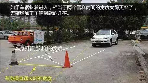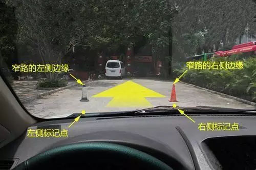 在車子慢慢靠近窄道的過(guò)程中,只要不讓兩側(cè)的邊緣在這兩個(gè)點(diǎn)的范圍內(nèi),那就是可以安全通過(guò)的。